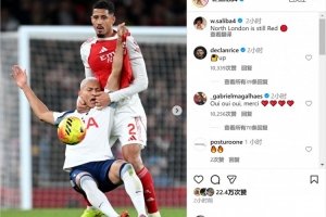 萨利巴社媒晒出防守里沙利松的照片,庆祝球队取胜,配文:“北伦敦依然是红色的。”
