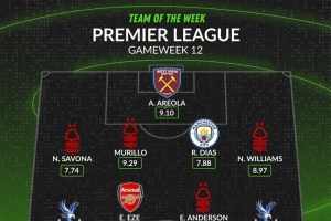 体育资讯11月25日讯 WhoScored根据球员的评分排出了英超第12轮最佳阵容,埃泽、鲁本·迪亚斯、罗杰斯在列,诺丁汉森林4名球员入选。