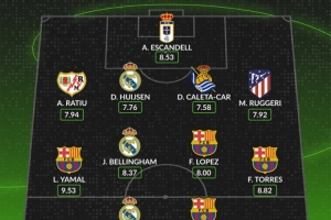 中场:拉明·亚马尔(巴塞罗那,9.53分)、裘德·贝林厄姆(皇家马德里,8.37分)、费尔明·洛佩斯(巴塞罗那,8.00分)、费兰·托雷斯(巴塞罗那,8.82分)