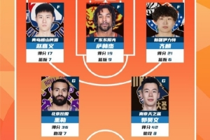 2025-2026赛季CBA联赛常规赛第1轮结束较量,来自青岛国信海天篮球俱乐部的赵嘉义,广东宏远篮球俱乐部的萨林杰,新疆广汇篮球俱乐部的齐麟,北京控股篮球俱乐部的里勒和南京同曦篮球俱乐部的郭昊文入选CBA联赛常规赛第1轮最佳阵容!