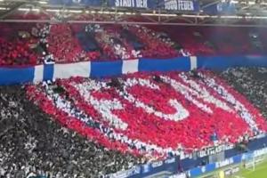 赛前沙尔克04球迷为欢迎来访的纽伦堡,完成了一次精美的TIFO变换,1秒钟由沙尔克04队徽变成纽伦堡队徽。