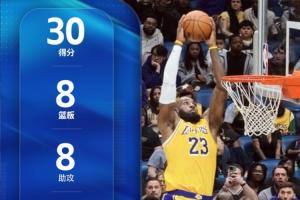 他全场比赛出战33分钟,19投10中,三分球5中3,7罚全中拿下30分8板8助2断1帽的数据,正负值+10。