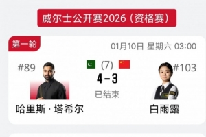 体育资讯1月10日讯 斯诺克威尔士公开赛资格赛首轮,白雨露3-4不敌哈里斯·塔希尔。