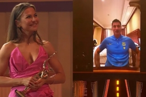 体育资讯1月11日讯 巴萨球星莱万荣获波兰媒体《体育评论》特别奖项“世纪最佳运动员”,他的妻子安娜代替正在沙特参加西超杯的莱万出席颁奖典礼。在现场连线中,莱万发表了自己的获奖感言。