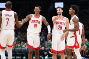 火箭(28-16):申京33分9板6助、杜兰特33分8板2助、伊森17分7板2断、阿门8分8板14助、史密斯8分8板2助2断、谢泼德4分4板、芬尼-史密斯3分2板2助2断、奥科吉2分7板2助、卡佩拉3板、泰特1板1助。