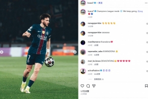 克瓦拉茨赫利亚也在赛后通过社媒晒出自己的比赛照,并配文:“欧冠模式❄️ 我们继续前进,@巴黎圣日尔曼 🔴🔵”