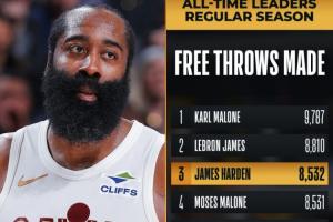 本场过后,哈登生涯总罚球命中数来到8535个,超越摩西·马龙(8531个)升至历史第3,排在第2的是詹姆斯(8810个)。