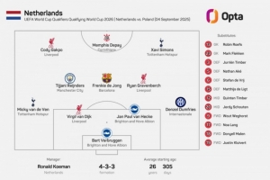 数据统计显示,这也是荷兰队史首次首发有8人都来自同一海外联赛: