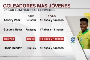 南美世预赛最年轻进球者排名: