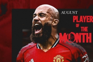 姆伯莫8月为曼联出战4场比赛,打进2球,曼联官方晒出海报,宣布他当选8月份队内最佳球员。