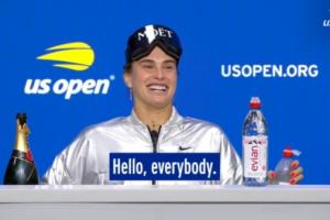 赛后萨巴伦卡拿着一瓶香槟和一瓶水到发布会现场,萨巴伦卡说道:大家好,这会是一场有趣的媒体发布会。