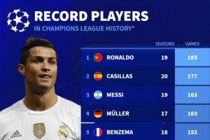 体育资讯09月16日讯 今夜,新赛季欧冠就将打响。德转在赛前列出了欧冠历史出场榜,C罗以183场位列榜首,卡西、梅西分列二三。