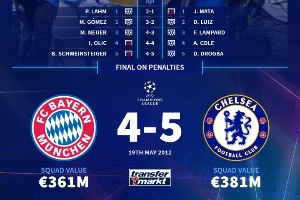 体育资讯09月17日讯 北京时间明晨3:00,拜仁坐镇安联主场迎战切尔西。赛前,德转官方回顾了2012年切尔西在安联球场力克拜仁夺冠的历史性一役时双方的阵容。