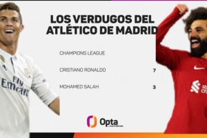 在欧冠赛场上,萨拉赫7次面对马竞打进3球。在这项赛事中,萨拉赫面对床单军团的进球数量仅次于C罗(12场7球)。