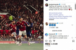 舍什科写道:“团结在一起并肩战斗,无所畏惧。老特拉福德气氛热烈,所有人目标一致,继续前进!加油曼联!”