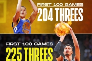 体育资讯9月22日讯 美媒Clutch Points晒出一张文班、库里还有克莱的生涯前100场比赛三分球的命中总数图。其中库里生涯前100场进了200个三分,而克莱是204个,而文班作为内线投中了225个。