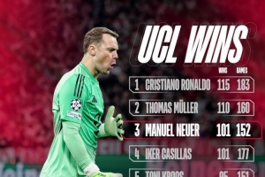 拜仁官方晒出了球员欧冠胜场排名,诺伊尔取胜101场与卡西并列历史第三多,仅少于C罗和穆勒。
