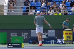 事件发生在比赛第1盘的第5局,范德尚舒普在发球局遭到了破发,这位荷兰选手先是将球扔出了场外,随后又愤怒地掷出球拍,球拍飞到了看台上,险些击中现场的观众。