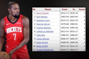 杜兰特在休斯敦对阵火箭季后赛共砍下7次30+,为历史最多(共7场)。