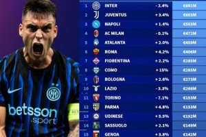 意甲俱乐部阵容身价排名(单位:亿欧元):