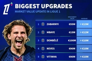 体育资讯10月12日讯 德国转会市场更新法甲球员的身价,并列出身价上涨榜单,扎巴尔尼+1300万欧居首,巴黎球员占据前7名。