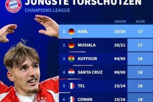 拜仁队史欧冠最年轻进球者排名: