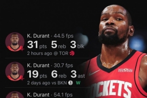 据统计,杜兰特火箭生涯4场比赛得分破百,队史第二快,仅次于哈登(3场)。