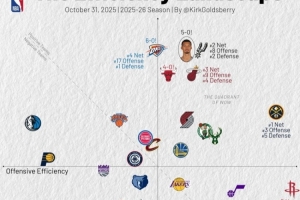 横轴代表进攻效率,越靠右越好,纵轴代表防守效率,越靠上越强。第一象限的球队多为发挥出色的球队,而在第三象限的球队通常为战绩比较糟糕的球队。