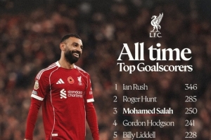 利物浦官方社媒晒出了队史射手榜,萨拉赫以250球排名第三位,距离首位伊恩-拉什差96球。