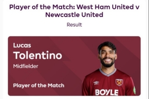 体育资讯11月3日讯 英超第10轮西汉姆联主场3-1击败纽卡,据赛后英超官方消息,帕奎塔被评为此役全场最佳球员,获43%的投票。