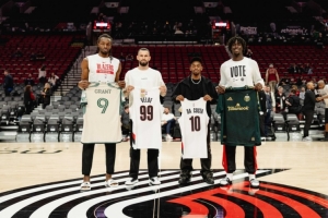 体育资讯11月4日讯 美职联波特兰伐木工队球员大卫-达-科斯塔、维尔德在美职联季后赛间隙到主场支持开拓者。球队也由格兰特、西索科做代表送出了定制球衣。