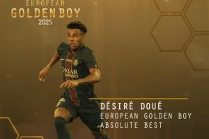 体育资讯11月04日讯 金童奖官方宣布,20岁的巴黎前锋杜埃荣膺2025年金童奖,击败了居莱尔、赫伊森、库巴西等候选球员。